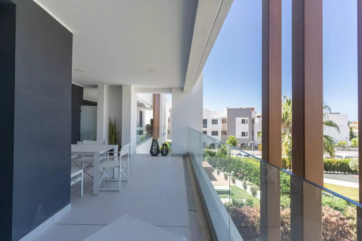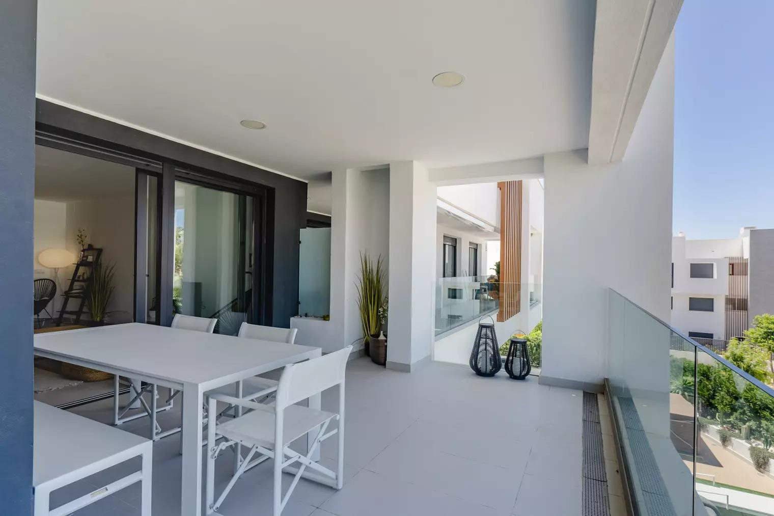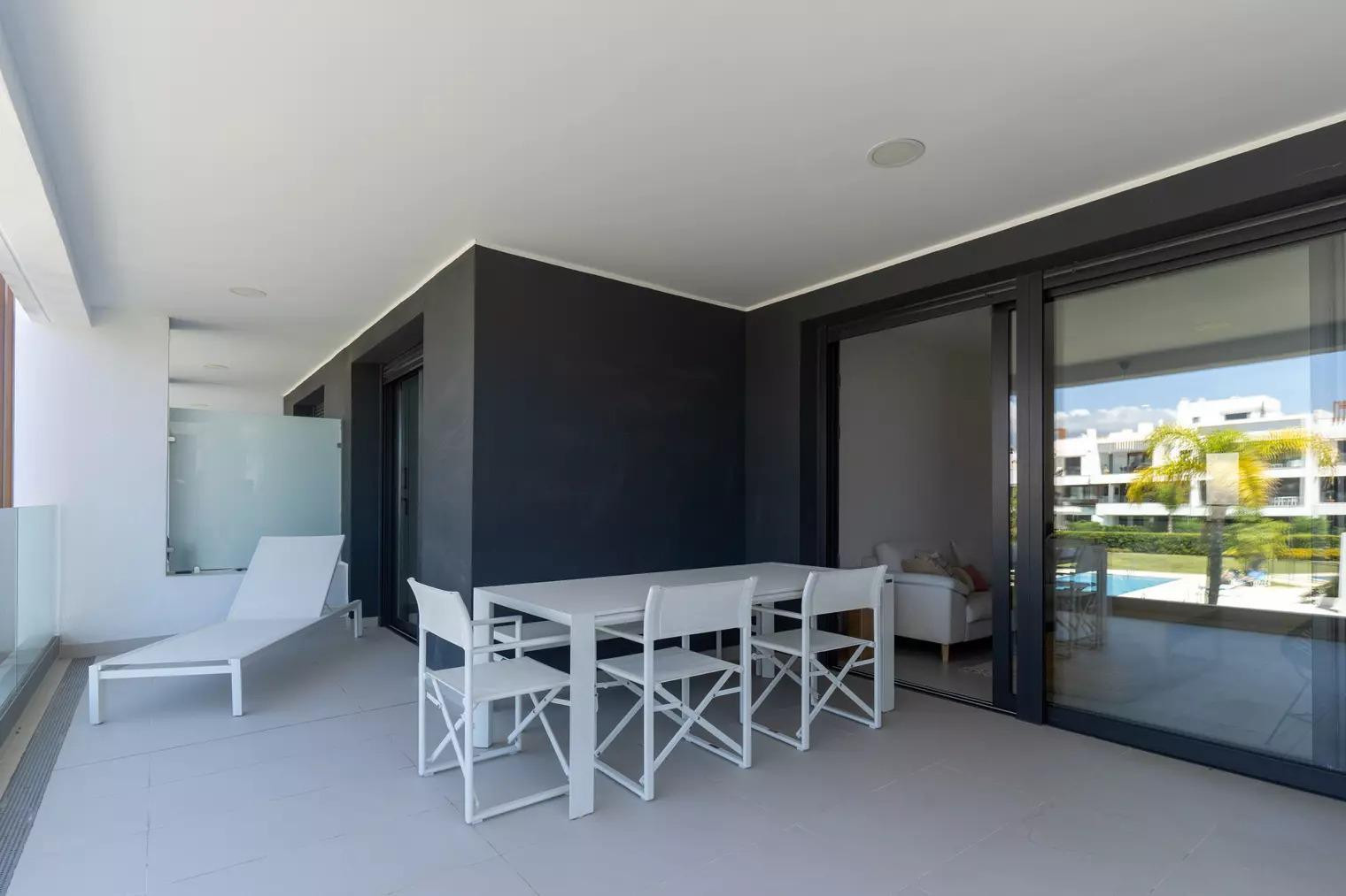 The apartment has access to a private outdoor area with a furnished covered terrace and a balcony.