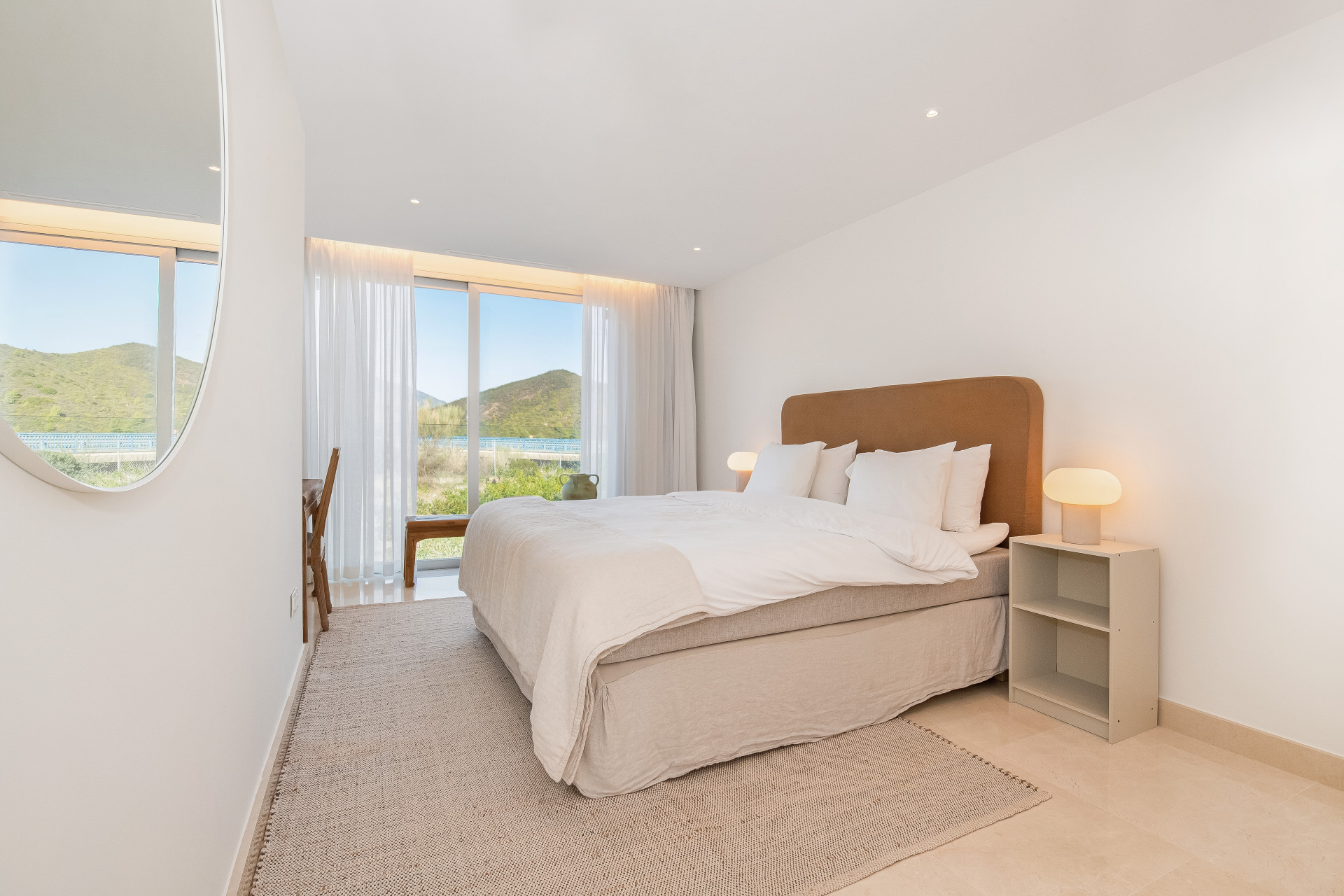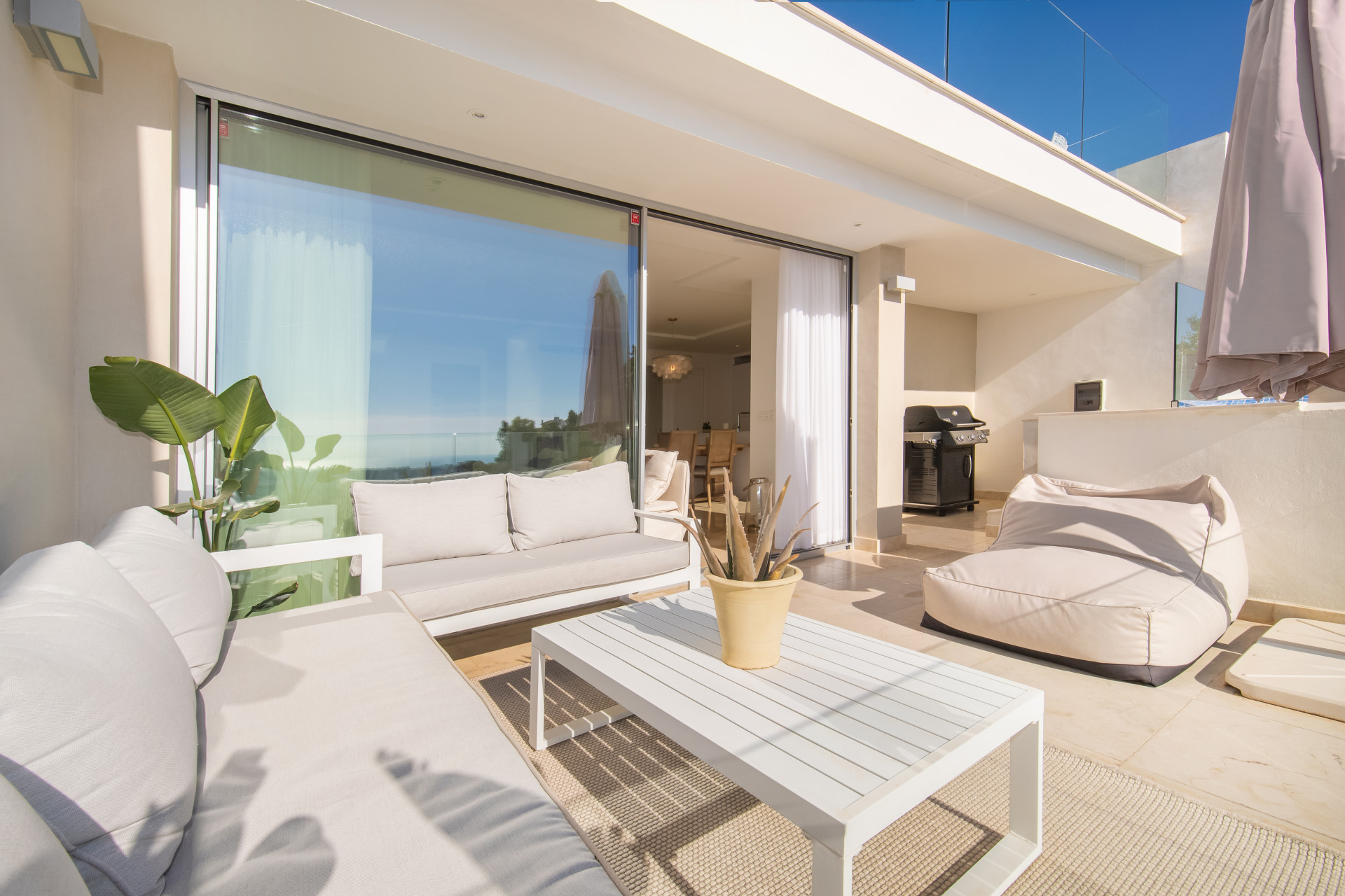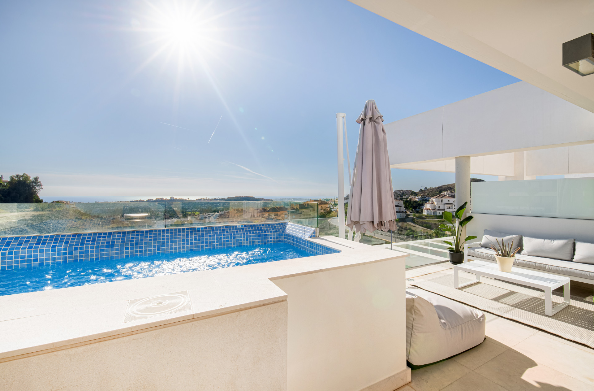 An expansive terrace that’s perfect for outdoor living, complete with a refreshing plunge pool, as well as a cozy sitting and dining area. It’s the ideal spot to soak in the mesmerizing vistas of both the mountains and the sparkling ocean, especially during the enchanting evening hours.